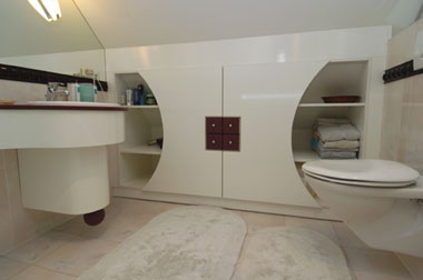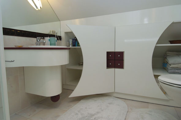Auch bei wenig Platzangebot gibt es immer weider funktionelle Lösungen wie hier eine angepaßte Türe mit offenen Fächern neben dem Waschtisch